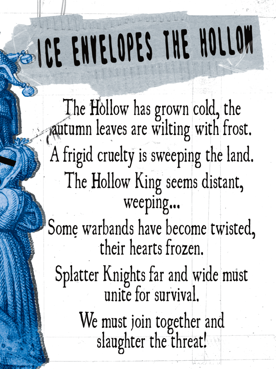 Pleased to announce another Splatter Knight release. War of the Frozen Heart a zine for Splatter Knight that expands the scope of the game with some additional modes of play and unit options. Included is the framework for a narrative scenario between two warring factions and extra abilities and options for those warbands. We would also like to extend a hand to any creator or hobbyist that wants to support bringing Splatter Knight to their local store or club. We will support anyone who wants to run events or collaborate with us. As always our DMs are open. We hope War of the Frozen Heart fixes your heart or gives you the strength to rip it out of those ice cold bastards.